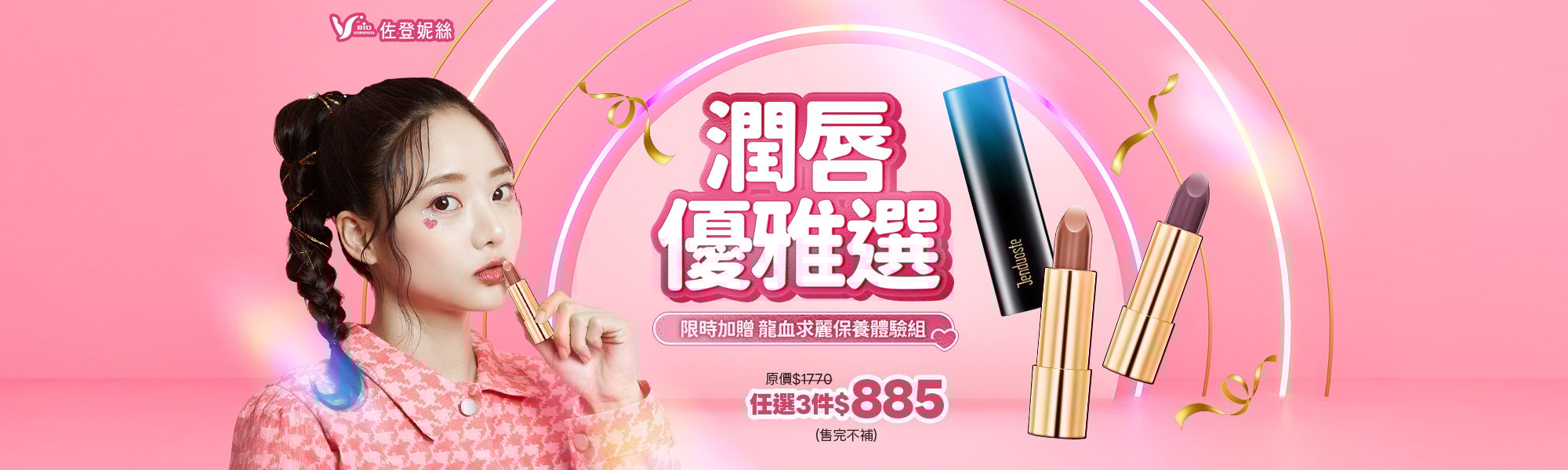 潤唇優雅選・限時優惠 任選3件【完美訂製顯色潤唇膏】只要$885, 再加贈「龍血保養體驗組」乙份! 展現你的專屬唇色魅力。 (有效期限至2026/05/19)